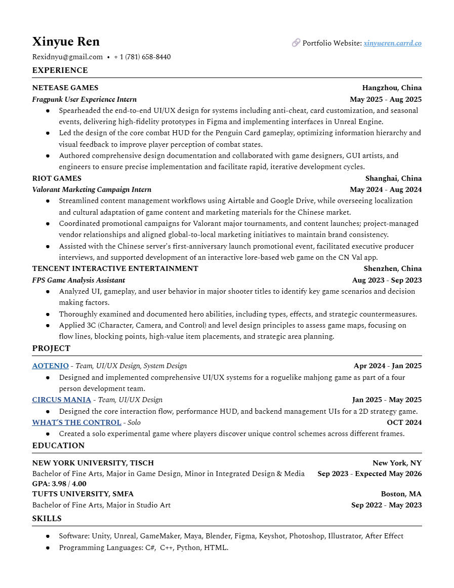 Hi! I'm Xinyue Ren, an undergraduate game designer and visual artist at NYU's Game Design program, minoring in Integrated Design & Media. Before NYU, I spent my freshman year at Tufts University studying Studio Art – an experience that shaped my approach to combining visual storytelling with game design.I specialize in game design, visual art, and UI/UX development. With proficiency in game development and design software, I transform concepts into playable experiences while creating compelling visuals. Beyond digital creation, my passion for gaming extends to Cosplay, with seven years of experience bringing video game characters to life.Connect: [email protected]